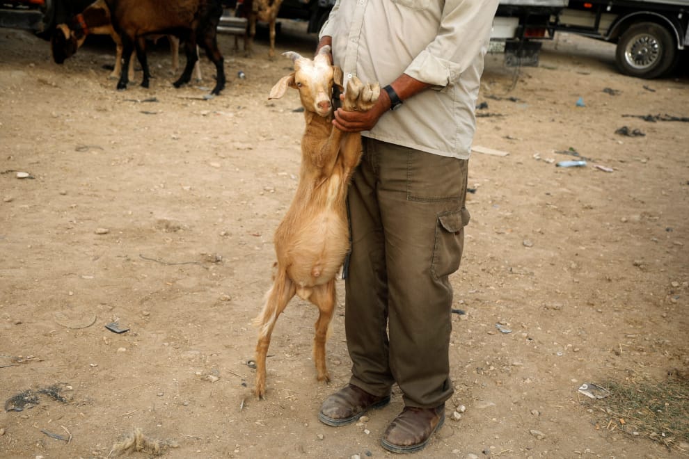 在約旦河西岸的納布盧斯市(Nablus),一名男子帶著他豢養的山羊到牲畜市場上販售,這隻山羊準備用於宰牲節(Eid al-Adha)。