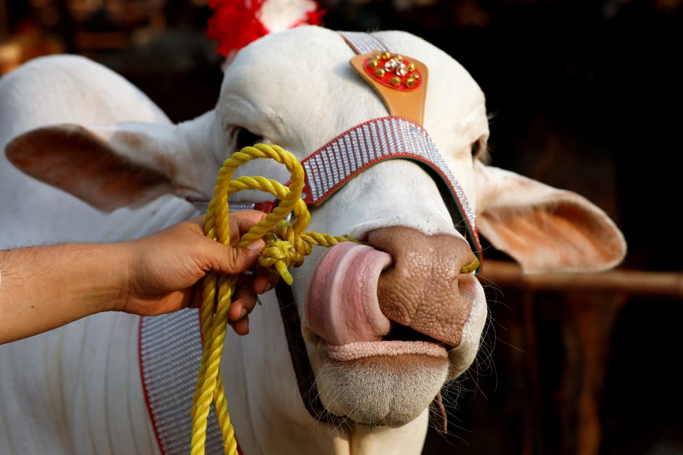 在巴基斯坦北部的白沙瓦市(Peshawar),牛販牽著一頭祭祀用的牛來到牛市上販售,準備迎接穆斯林重要節日宰牲節(Eid al-Adha)。