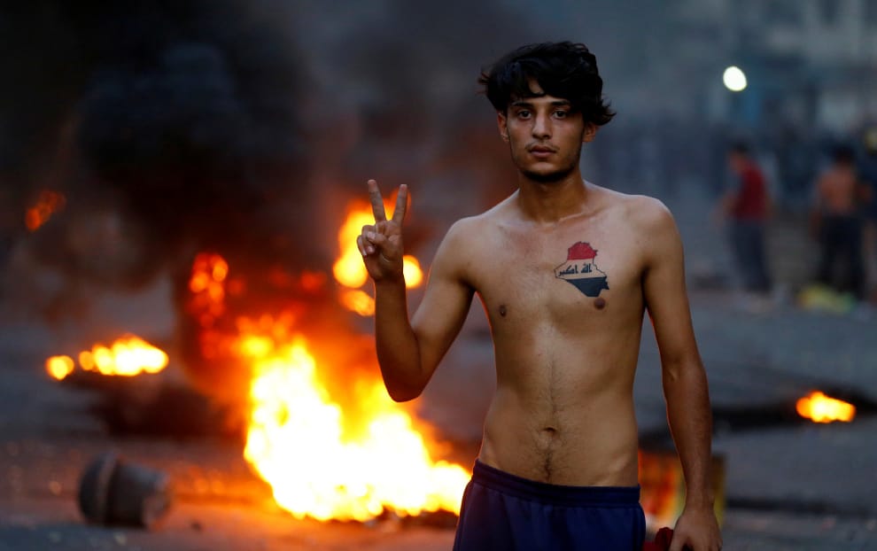 在首都巴格達,民眾上街抗議當局糟糕的大眾服務系統,一名參與示威的民眾在熊熊火光前比出勝利手勢。