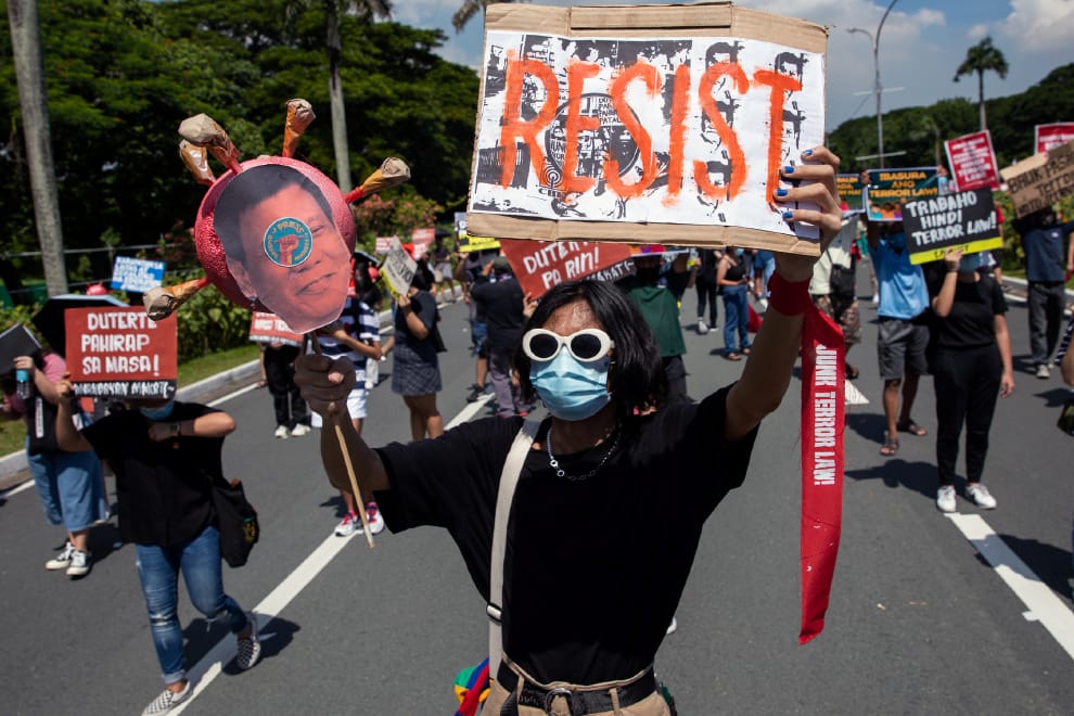 在菲律賓人口最多的城市奎松市(Quezon City),民眾上街抗議菲律賓總統杜特蒂(Rodrigo Duterte)防疫不力、箝制媒體,並且企圖利用疫情限制打壓異議人士,妨礙民眾集會遊行的自由。