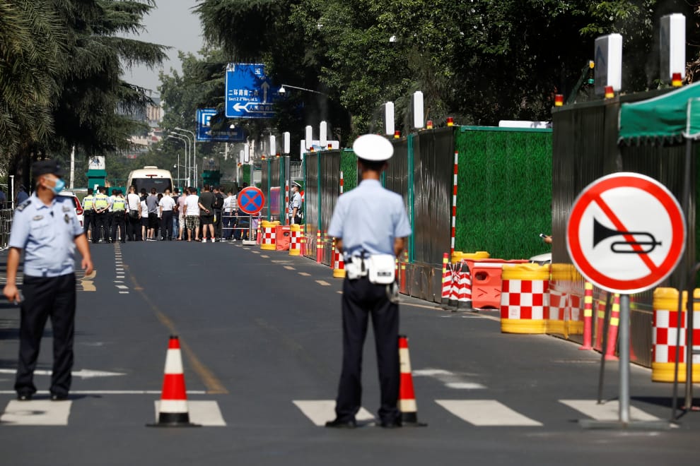 這些詐騙案常以偽裝成大使館或是公安為起手式,欺騙受害者誤信自己或是家人不小心涉案。圖為周一(27)白天,一名中國公安出現在美國駐成都總領館附近。