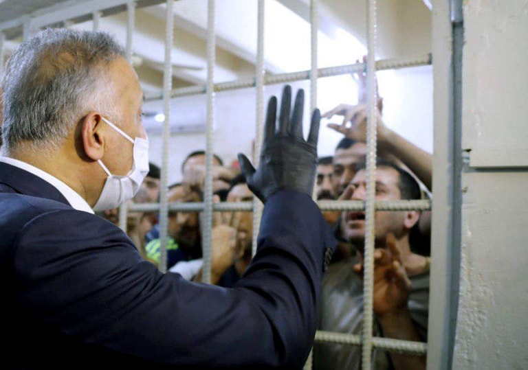在巴格達Al-Muthana機場的中央調查監獄,伊拉克總理卡迪米(Mustafa al-Kadhimi)前來探監。