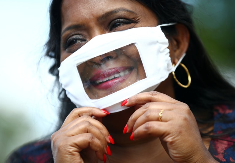 在倫敦,聽障賦權社會組織(Empowering Deaf Society)的負責人蘇塔珊(Mangai Sutharsan)向鏡頭展示能露出嘴巴的半透明口罩。