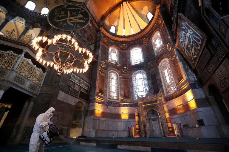 在位於伊斯坦堡的聖索菲亞清真寺(Hagia Sophia Grand Mosque),防疫人員在宰牲節(Eid al-Adha)前夕全副武裝消毒建築物內外。