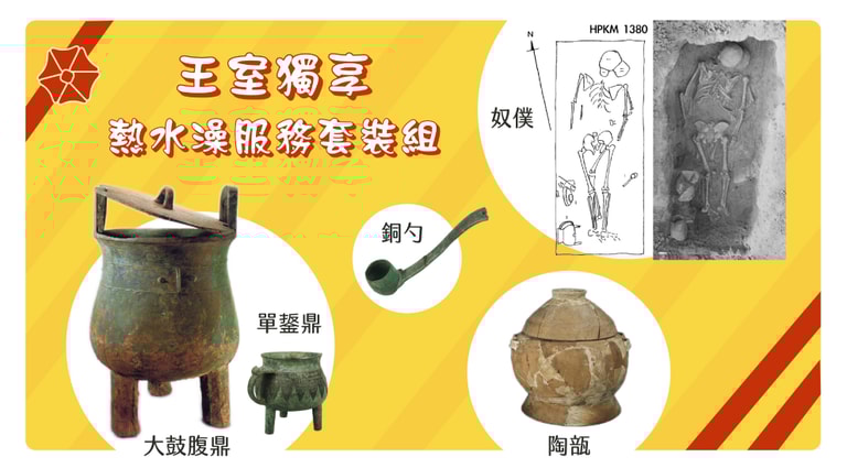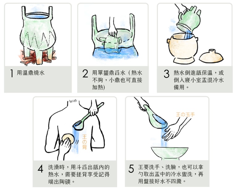 用溫鼎燒水,再以單鋬鼎舀水(熱水不夠,小鼎也可直接加熱),倒進瓿保存,或倒入寢小室盂混冷水備用。洗澡時,用斗舀出瓿內的熱水,需要搓背享受記得端出陶磢。王要洗手、洗臉,也可以拿勺取出盂中的冷水盥洗,再用盤接好水不四濺。當然,這一系列舒服的梳洗樂事,都少不了奴僕來服侍(幫陪葬人骨 QQ)