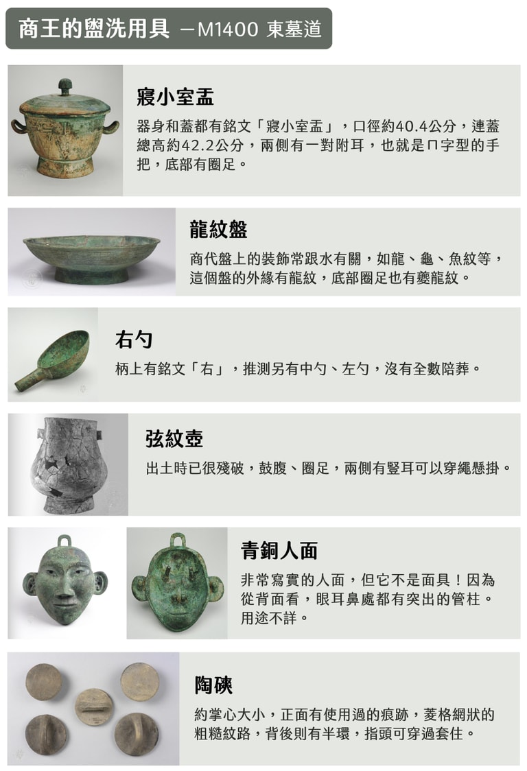 盂,是商代常見的盛水容器;寢小室意指寢室的洗澡間。這組文物出土自東墓道,而陵墓大多比照王宮來建造,也就是說,當時商王的豪華宮殿中,洗澡間可能位於寢殿東側,這組器物則是澡間裡的盥洗用具。