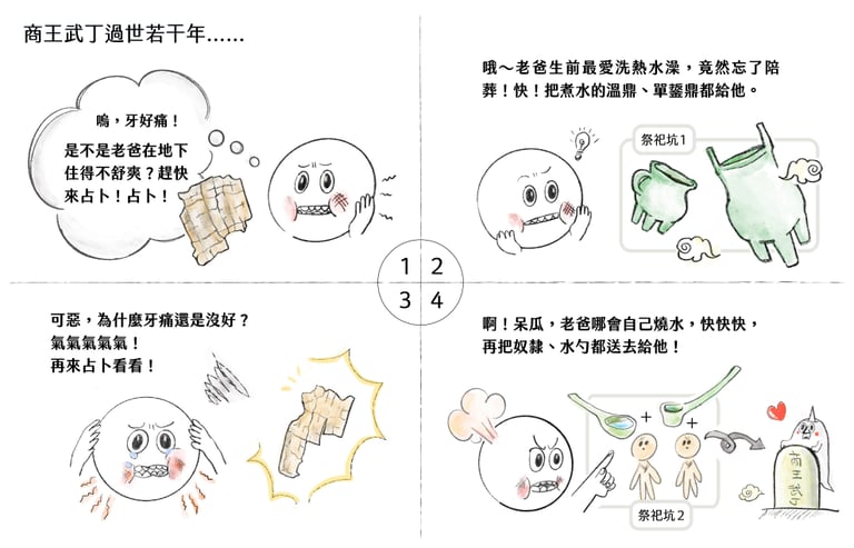 線索一個串一個,就像柯南在連番推理後,突然鏡片反光一閃「原來如此!真相就是……」讓我們把商王、后妃的墓與幾座祭祀坑並列觀察,將以上線索整理一下: