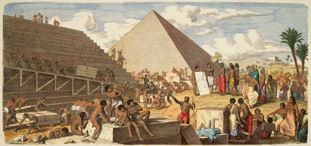 圖為古埃及金字塔建造示意圖,當時花了上萬人才蓋好金字塔。