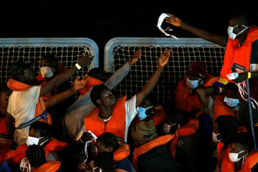 在瓦萊塔港(Port of Valletta),被馬爾他軍方救上船的移民正在分發口罩。
