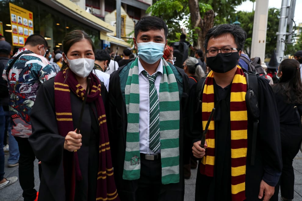 在曼谷街頭,參與反政府示威活動的民眾穿上《哈利波特》(Harry Potter)主題的服裝抗議,這裡舉行的示威活動每天的主題都不一樣,參與者也會搭配主題挑選服裝。