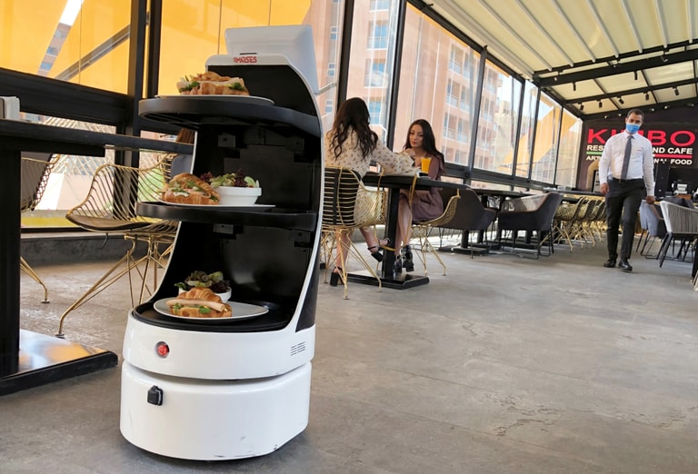 在開羅一間餐廳內,送餐機器人正忙著將美味的餐點送到顧客桌上。為了拉開社交距離,不少餐廳都開始使用送餐機器人,降低人與人之間的接觸。