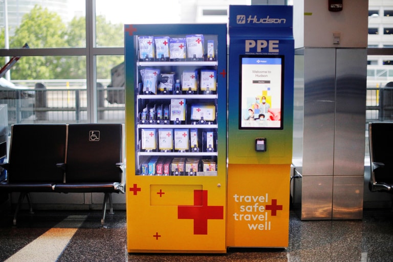 在波士頓洛根國際機場(Logan Airport),可以看到為了因應疫情出現的防護服販賣機,供需要搭機旅行的乘客選購。
