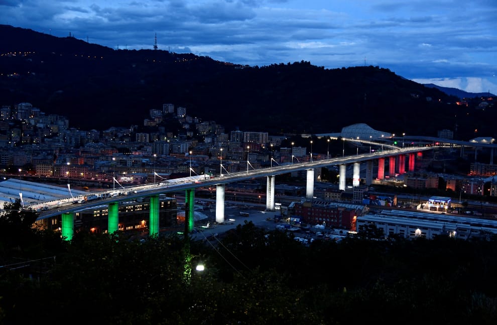事隔兩年,位於義大利北部港口城市熱那亞(Genoa)的「莫蘭迪」大橋(The Morandi Bridge)終於重建完成,在啟用這一天也打上了義大利的國旗色慶祝。