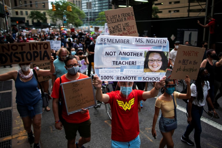 在紐約街頭,反對開學的民眾舉牌抗議,他們不滿當局沒有規劃好配套措施,就貿然讓師生重返校園,極有可能導致疫情擴散。其中,一名戴著面罩的男子手舉因染疫過世的老師照片,呼籲政府實施百分之百的遠距教學,不要再有另一個老師犧牲。