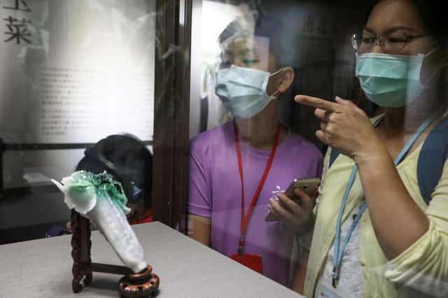 在國立故宮博物院,參觀民眾戴著口罩欣賞鎮館之寶「翠玉白菜」。