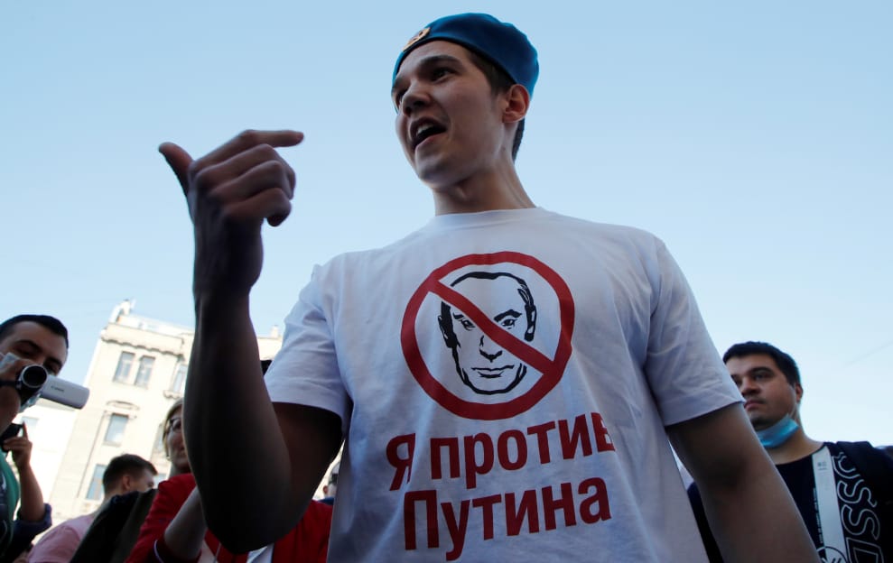 在聖彼得堡,一名男子穿著寫有「我反對普亭」字樣的T恤,參與聲援遠東地區「哈巴羅夫斯克邊疆區」(Khabarovsk Region)首長富爾加爾(Sergei Furgal)的活動。