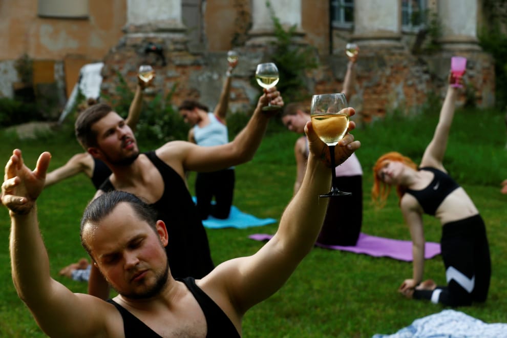 在首都里加,參與飲酒瑜珈的民眾一邊享受瑜珈帶來的放鬆感,一邊品嚐令人微醺的美酒。