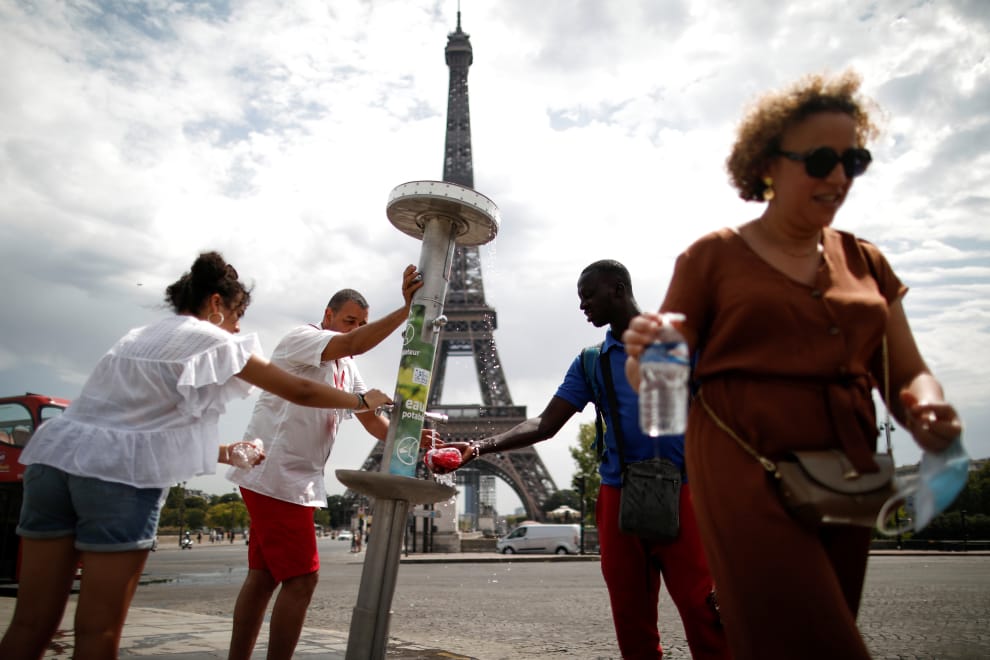 在遭到熱浪攻擊的法國巴黎,民眾在艾菲爾鐵塔(Eiffel Tower)附近設置的消暑站喝水降溫。