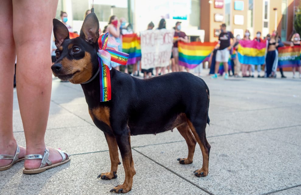 在位於北部的比得哥什市(Bydgoszcz),一隻綁著彩虹蝴蝶結的狗狗跟著主人上街參加支持LGBT的活動。
