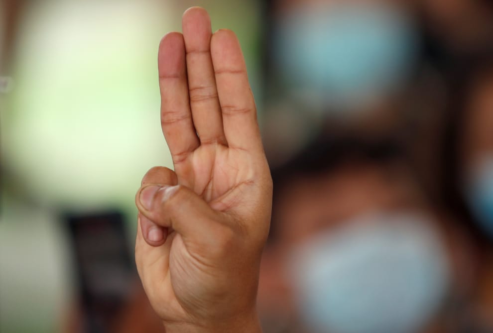 在曼谷街頭,參與反政府示威活動的民眾模仿電影《飢餓遊戲》中的反政府手勢,要求當局釋放民權運動領袖,並且呼籲貪汙腐敗的帕若育(Prayut Chan-o-cha)政府盡快下台。