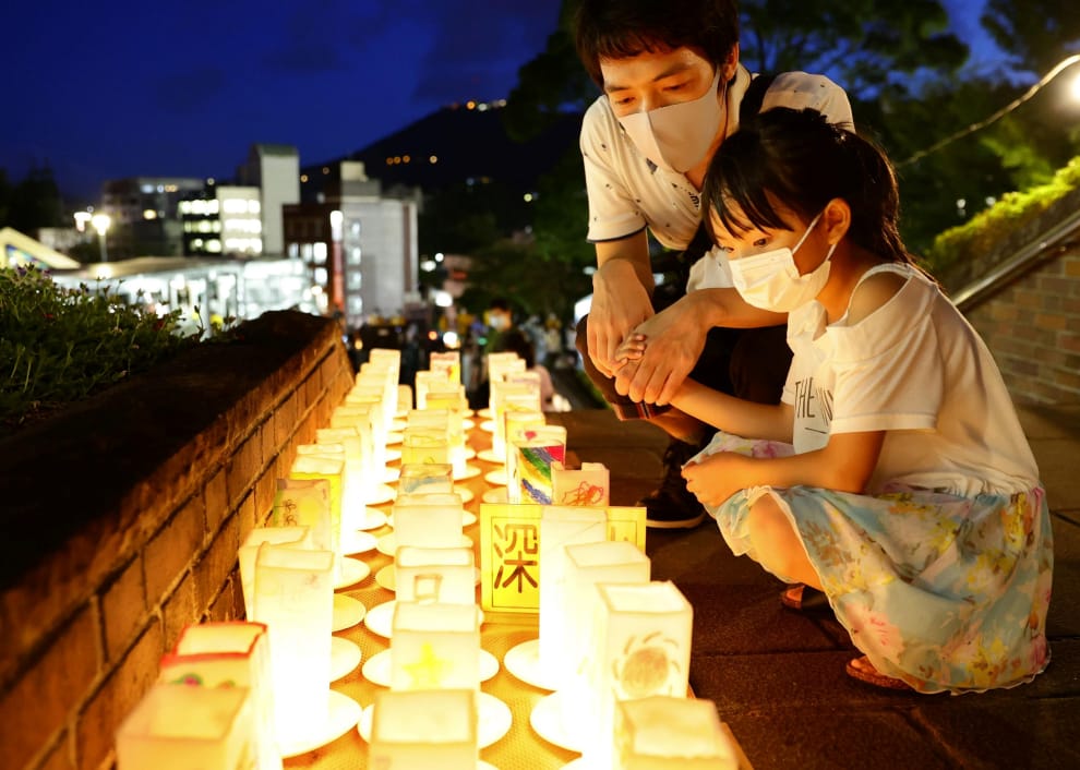 在長崎和平公園,一對父女在長崎原爆 75周年紀念蠟燭前駐足,悼念在二戰原子彈爆炸中罹難的民眾。