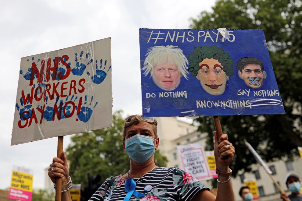 在倫敦街頭,不滿英國國民保健署(NHS)遲遲不加薪的醫護人員上街抗議,要求NHS替醫護人員加薪 15%,讓在防疫第一線的他們可以沒有後顧之憂,能夠專心照顧患者。