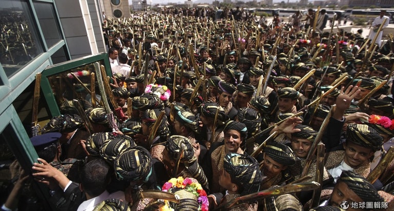 照片中高舉寶劍的是等著進場的新郎,當地正舉辦多達4,000人的結婚典禮
