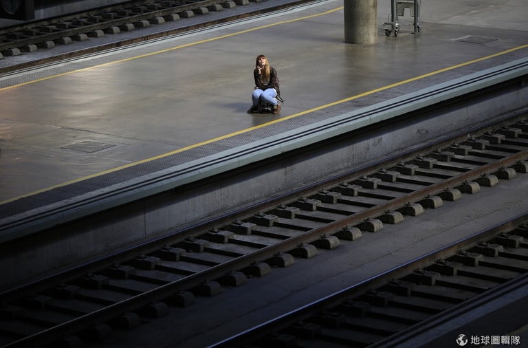一名女性蹲坐在她的行李箱上,等待火車中。當地民眾不滿鐵路私營化,正發起長達24小時的鐵路罷工行動
