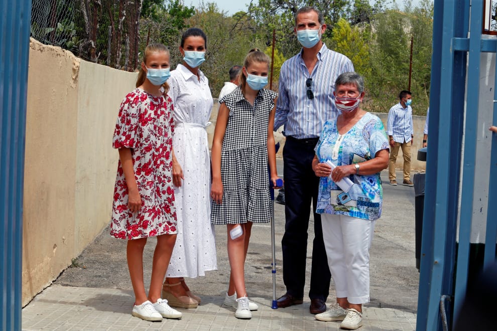 每年夏天,西班牙王室都會舉家來到位於地中海的馬約卡島(Mallorca)度假,今年也可以看到西班牙國王菲利普六世(King Felipe VI,右二)、王后萊蒂西亞(Queen Letizia,左二)、阿斯圖里亞斯女親王(Princesa de Asturias,左一)萊昂諾爾(Leonor)和西班牙王女蘇菲亞(Sofía,中)與當地教育機構負責人荷達(Margarita Jorda)留影。