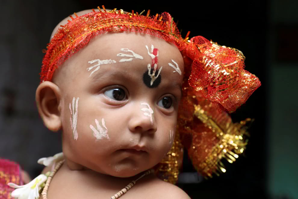 在加爾各答的一座神廟內,一名孩童打扮成印度教神祇黑天神的模樣,和家人一起歡度黑天聖誕節(Janmashtami)。