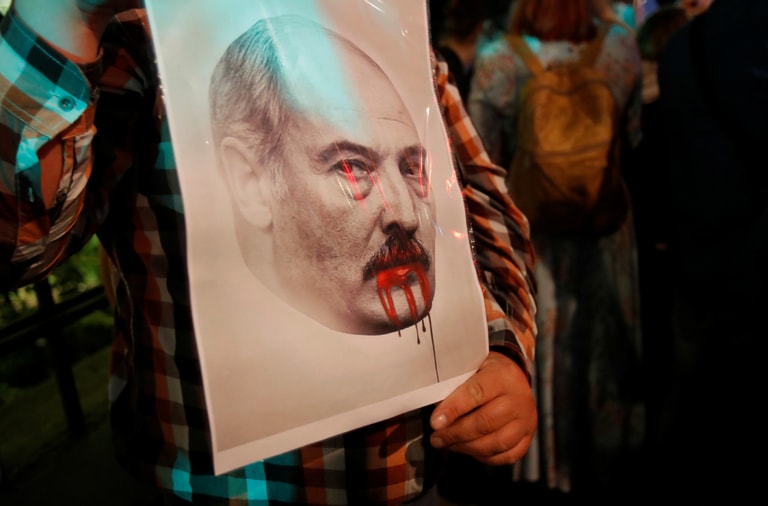 在莫斯科的白羅斯駐俄大使館前,反對白羅斯總統大選結果的民眾手拿白羅斯總統盧卡申科(Alexander Lukashenko)的照片抗議。