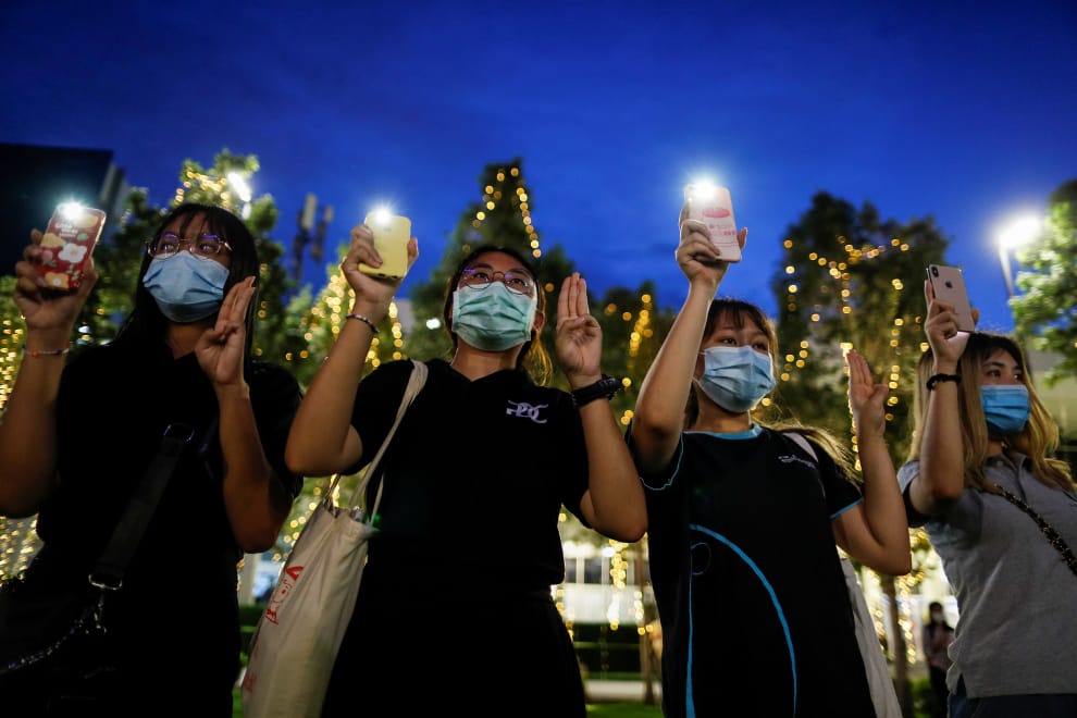 在位於曼谷的泰國商會大學前,親民主的學生們模仿電影《飢餓遊戲》中的三指併攏反政府手勢,呼籲貪汙腐敗的帕若育(Prayut Chan-o-cha)政府盡快下台。