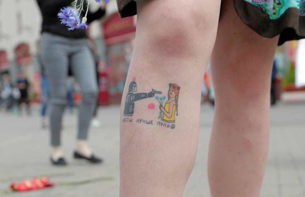 在首都明斯克抗議警察暴力的現場,一名女子腳上的刺青寫著「鮮花比子彈好」。