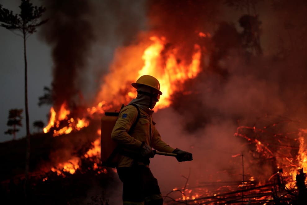 在亞馬遜州的阿普伊(Apui),巴西環境與可再生自然資源機構消防人員正在救火。