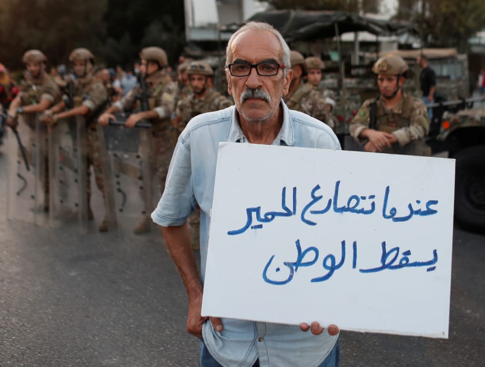 在首都貝魯特街頭,參與反政府示威的民眾在鎮暴部隊前舉牌抗議,他的牌子上寫著「當驢子都要上街抗議,這個國家就完蛋了」。