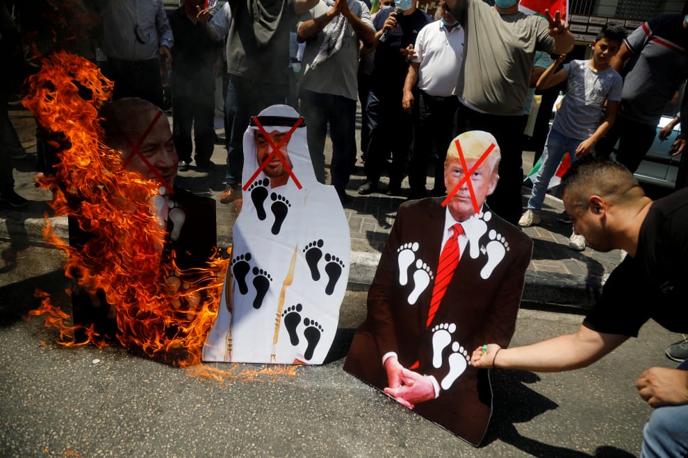 在約旦河西岸的納布盧斯市(Nablus),反對以色列和阿拉伯聯合大公國達成和平協議的民眾,火燒居中牽線的美國總統川普(Donald Trump)立牌,以色列總理納坦雅虎(Benjamin Netanyahu)和阿聯實際上的統治者、阿布達比王儲阿勒納哈揚(Mohammed bin Zayed)也在其中。