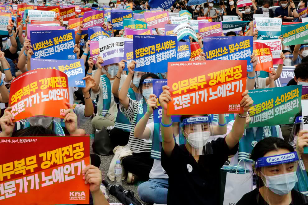 在首爾街頭,醫生們舉牌參加 24小時罷工活動,抗議政府放寬醫學院入學限制、明年要多錄取 400名醫學生的決定。南韓當局表示,增加醫學生員額是為了預防未來可能再有大型傳染病的公衛危機。