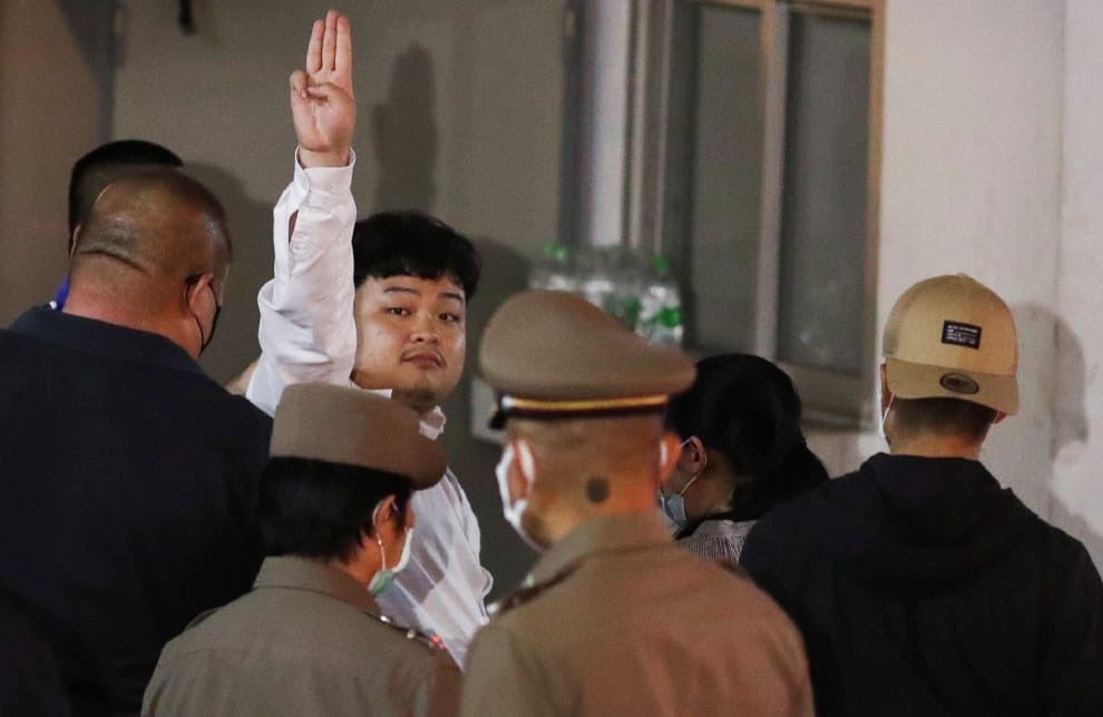 在曼谷警局,發起反政府示威活動的學生領袖巴利(Parit Chiwarak)對著鏡頭比出電影《飢餓遊戲》中的三指併攏反政府手勢,呼籲貪汙腐敗的帕若育(Prayut Chan-o-cha)政府盡快下台。