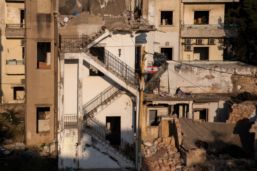 在靠近貝魯特港口、被爆炸波及的社區,可以看到破敗的建築上掛了一面黎巴嫩國旗。