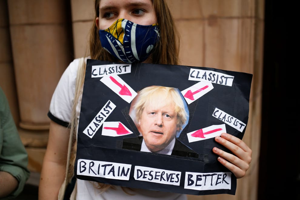 在英國首都倫敦,16號這天,在倫敦抗議A-level成績不公的現場,一名學生舉起貼有英國首相強生(Boris Johnson)照片的紙板,上頭除了批評他是階級歧視主義者外,也說英國值得一位更好的首相。