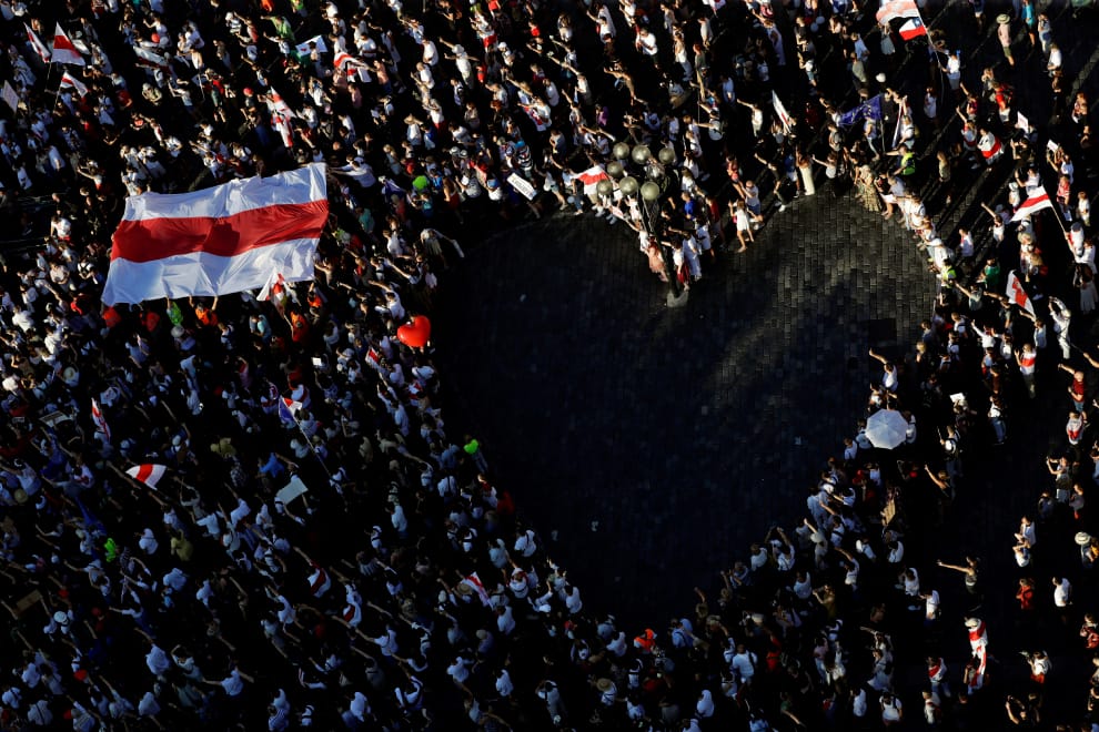 在捷克首都布拉格,民眾在一面白羅斯旗子旁排列出一個愛心,支持遠方在白羅斯街頭抗議總統大選有作票嫌疑的群眾。
