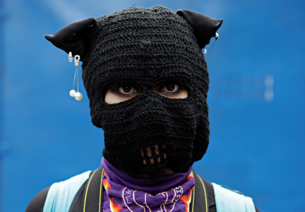 在墨西哥首都墨西哥城,墨國婦女再度為政府無力解決針對婦女的暴力事件走上街頭抗議。一名示威者戴上黑色面罩,準備上街參與抗爭。