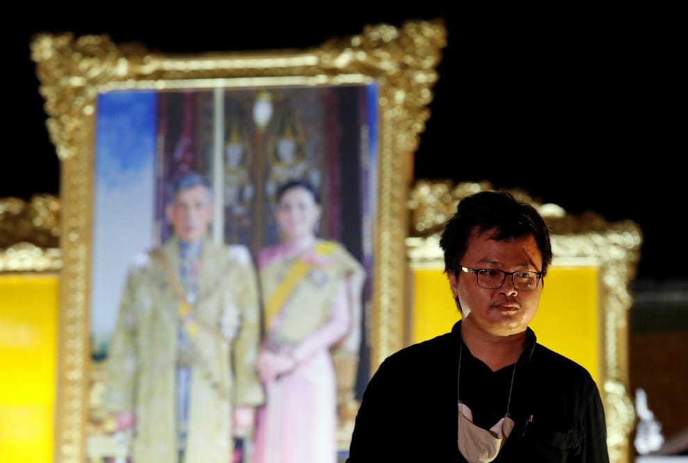 在泰國首都曼谷,攝影師拍下反政府示威領袖阿農(Anon Nampa)站在泰王瓦集拉隆功(Maha Vajiralongkorn)以及王后蘇提達(Suthida)肖像前的身影。