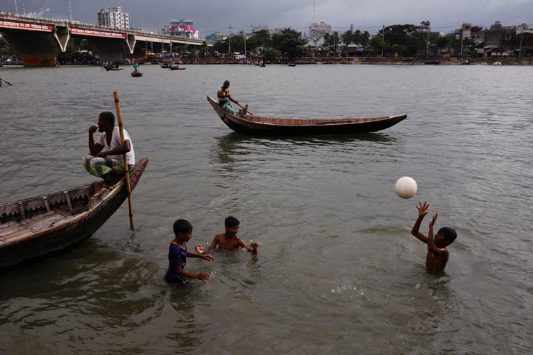 在孟加拉首都達卡近郊的布里甘加河(Buriganga River),孩子們開心地在水裡玩水。