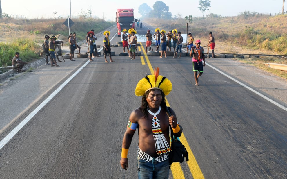 在巴西帕拉州(State of Pará)的新普羅格雷索(Novo Progresso),卡雅波族(Kayapo)的族人們在BR163高速公路上設置路障,抗議政府無力防堵COVID-19(武漢肺炎)在原住民的居住地區擴散。