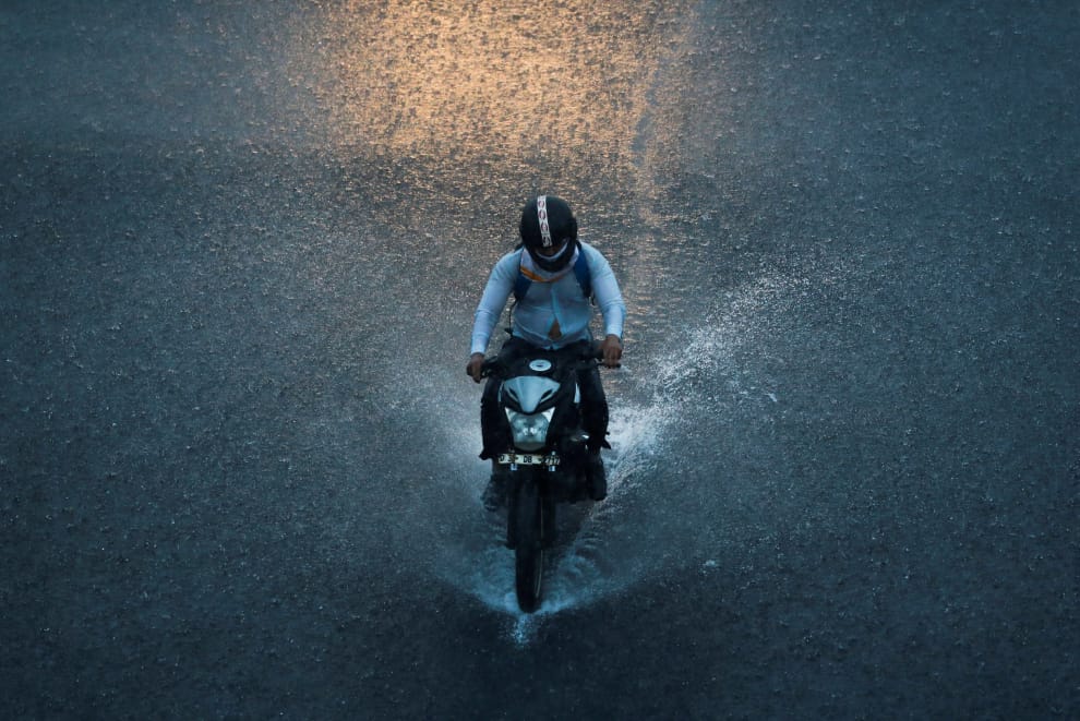 在印度首都新德里,一名男子冒著大雨,騎機車經過已經開始積水的道路。