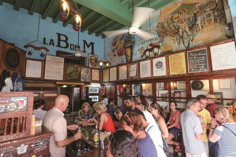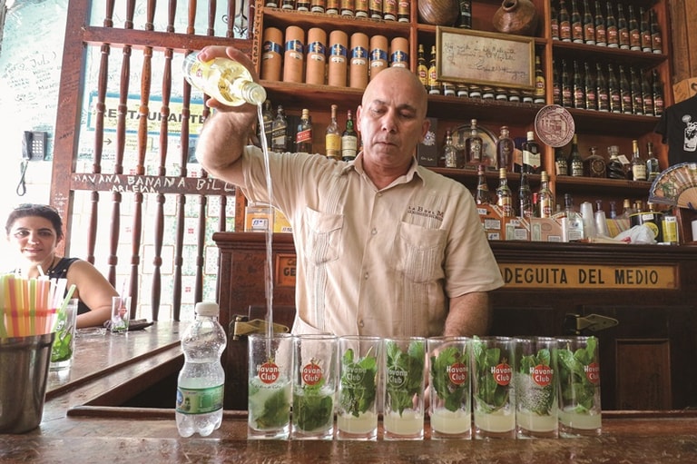 我漫步在哈瓦那老城區,不必開口詢問,只跟著歐美遊客的腳步後頭,就能找到大教堂廣場(Plaza de la Catedral)西北巷子內的五分錢小酒館。藍色門面上,到此一遊的留言塗鴉簽了滿牆;走進酒館,不大的空間裡坐滿遊客,吧檯上數只玻璃杯一字排開,調酒師用幾近反射動作的俐落手法,舉瓶、注酒、搗攪著薄荷葉和檸檬,只為加速滿足人手一杯mojito的朝聖需求。