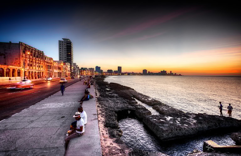 前者堪稱是哈瓦那的人文景觀中軸線,與美國國會山莊相媲美的國會大廈(Capitolio Nacional de la Habana),歐巴馬訪問古巴、發表演說的所在地哈瓦那大劇院(Gran Teatro de La Habana),16世紀西班牙國王所建、扼守哈瓦那灣的聖薩爾瓦多.德拉蓬塔城堡(Castillo de San Salvador de la Punta)等歷史景點,都在大道沿途;顏色鮮豔的老爺車奔馳在海濱大道,坐擁碧海藍天,拍攝方向面朝老城區,背景配上國會大廈的巨型穹頂,也是一絕。