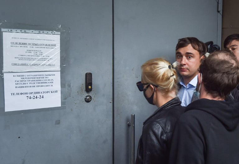 稍晚,納瓦爾尼的妻子尤莉亞(Yulia Navalnaya)和私人醫生瓦希里耶娃(Anastasia Vasilyeva)雙雙從莫斯科趕到醫院來探望納瓦爾尼,兩人卻一度被拒於門外,無法進入病房中探望,就連瓦希里耶娃醫生向醫院要求檢視納瓦爾尼的病歷也被拒絕。一直到當天晚上,尤莉亞才被准許進入病房探望納瓦爾尼。