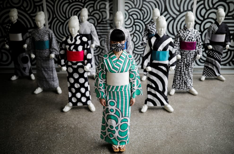 在日本首都東京的個人工作室內,藝術家高橋理子戴上口罩,與她設計的一系列浴衣合影。